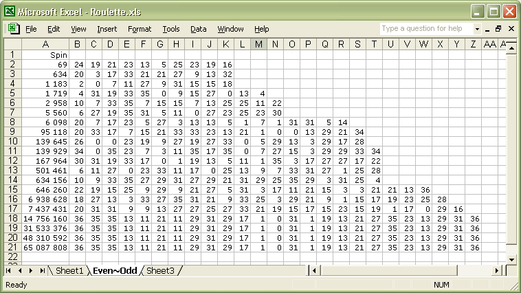 Решил поэксперементировать с экселовским генератором случайных чисел. Смоделировать рулетку. Проверить на чет/нечет или больше/меньше (1-18/19-36).