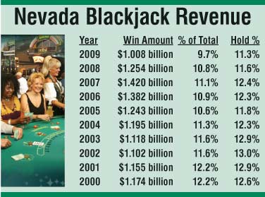 Блэкджек всегда был самой популярной игрой в Неваде. Но за последний год доходы от блэкджека упали почти на 20% и составили $1.008 миллиард, общий оборот снизился до $8.917 миллиарда, достигнув рекордного минимума с 2003 года.